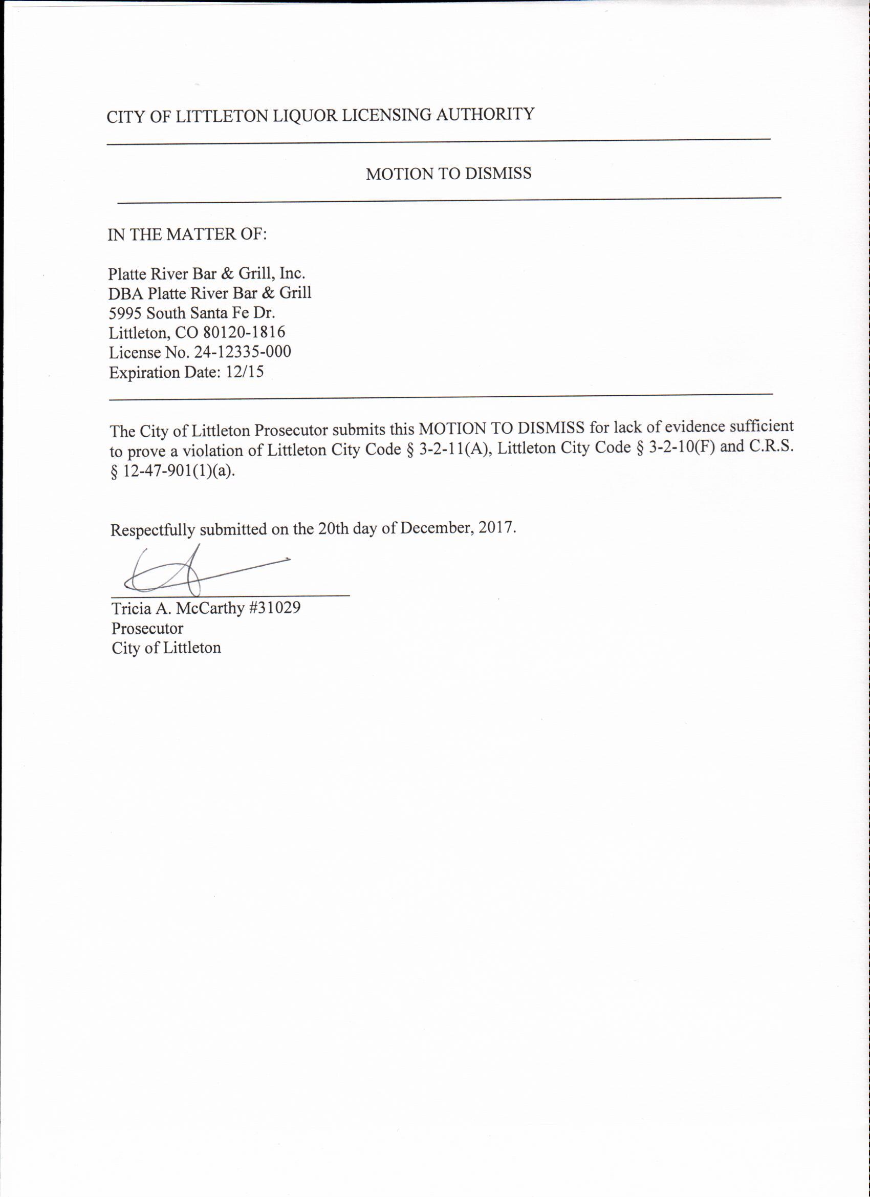 Motion to vacate finding of Probable Cause for Platte River Bar & Grill Inc. d/b/a Platte River Bar & Grill, 5995 S. Santa Fe Drive, Littleton, Colorado
